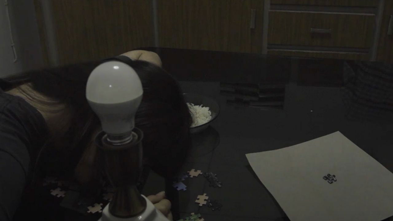 A woman appears in a random kitchen with a stranger. Things pop out in the kitchen out of nowhere. Puzzles, keyboards, tomatoes and rice. To sustain and obsess with each other.