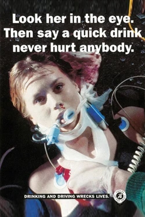 Part of the COI's infamous "Drinking And Driving Wrecks Lives" campaign which ran between 1987 and 1997. We see a single, uninterrupted shot but this time it's of a young woman laying on the asphalt after being hit by a drunk driver. As the camera pans slowly away from her eyes (one of which is dilated, an indicator of severe brain trauma) we see paramedics trying to resuscitate her as she lays lifeless in a pool of her own blood. Played over the footage is the audio of the drunk driver who caused the accident being quizzed by a police officer, desperately pleading for her to "be alright" – though it appears that the paramedics' attempts to resuscitate her continue to be futile.